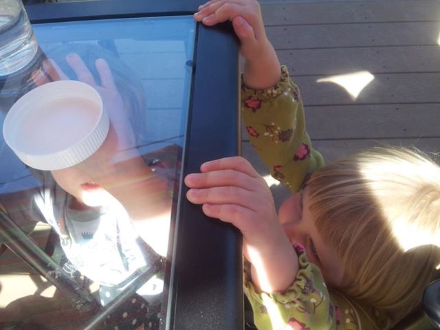 Ant trapped under jar lid. Looking up through glass tabletop. Fascinated.