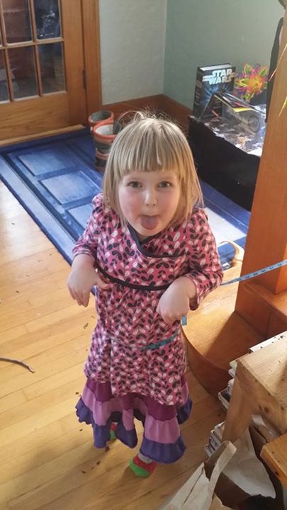 Note: that's a tailor's tape measure. Securing it to her waist and the banister are very important to kangaroo hops.